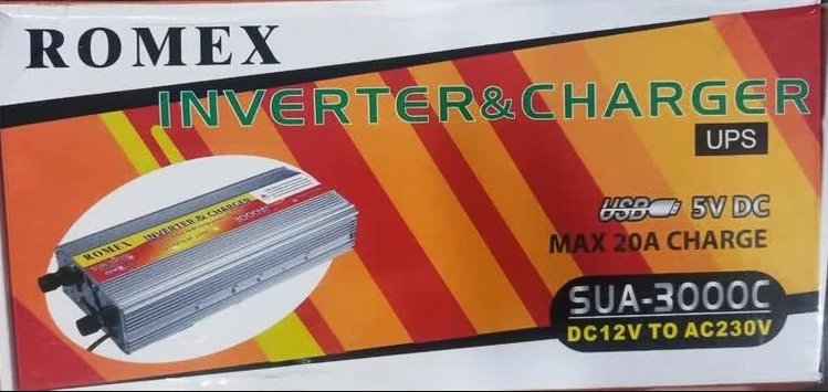 اینورتر شارژر برند رومکس SUA–3000Cاینورتر شارژر3000 وات برند رومکس SUA–3000C یکی از بهترین برندهای اینورتر – شارژر موجود در بازار بوده که دارای شکل موج شبه سینوسی اصلاح شده می باشد. این مدل از اینورترها داری شارژر ۲۰ آمپر برای شارژ باتری از طریق برق ۲۲۰ ولت بوده که جوابگوی مصارف معمولی مثل یخچال، روشنایی، تلویزیون و وسایل الکتریکی با توان خروجی کمتر از ۱۳۰۰ وات می باشند. مشخصات محصول:توان : ۳۰۰۰ واتبرند: رومکس شارژر باتری ۲۰ آمپر (شارژ توسط برق شهری ۲۲۰ – ۲۳۰ ولت)ولتاژ ورودی: ۱۲ ولتورودی برق شهر (AC): 230 V , AC , 50 Hz , 20 Aخروجی (AC): 230 V , 50 Hz , 6Aقابلیت راه اندازی کرکره برقی ، روشنایی ، کامپیوتر، ترازوی دیجیتال و...قابل استفاده در سیستم های برق خورشیدی و بادی و کمپینگ و...